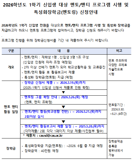| 2026-1학기 신입생 대상 멘토/멘티 프로그램 시행 및 특성화장학금(멘토링) 신청 안내 | |