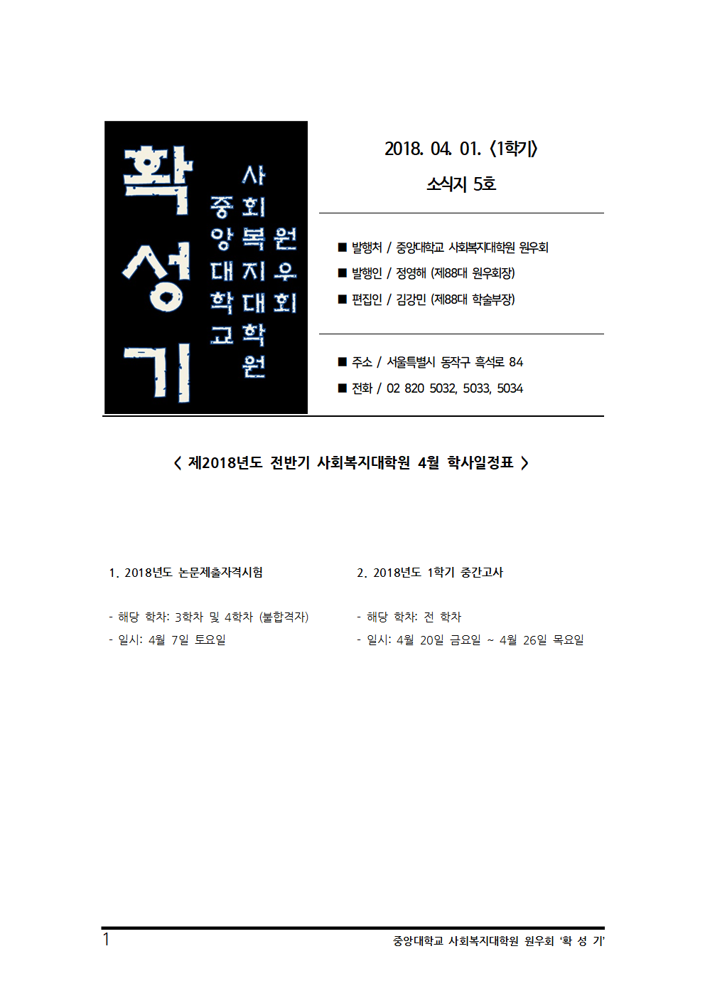 2018년 확성기 1학기 05호 4월 학사일정표